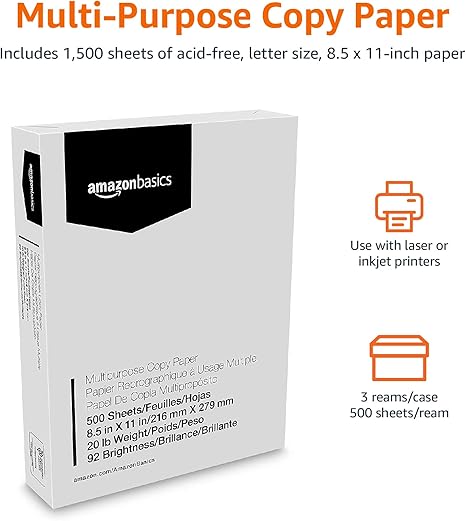 Amazon Basics Multipurpose Copy Printer Paper, 8.5″ x 11″, 20 lb, 3 Reams, 1500 Sheets, 92 Bright, White